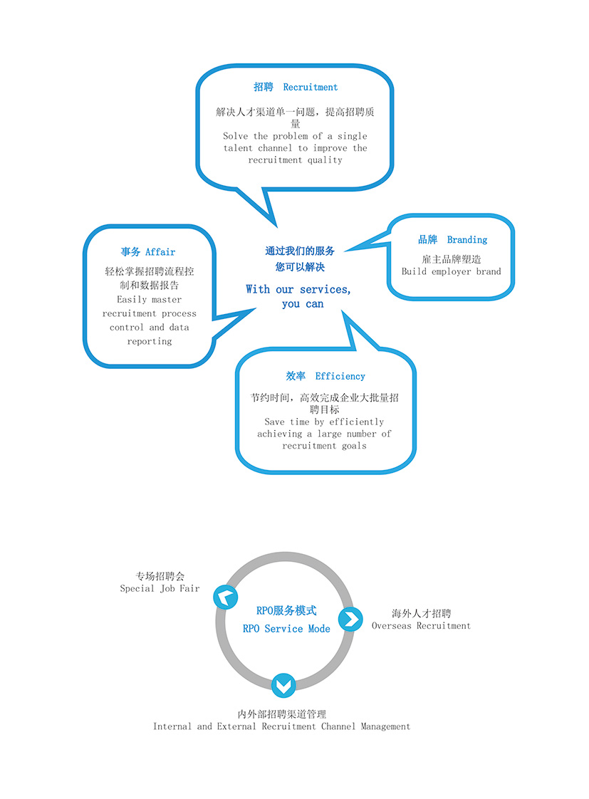 溝通offer,候選人入職管理等??傊?,RPO服務(wù)為客戶提供量身定制的招聘解決方案。